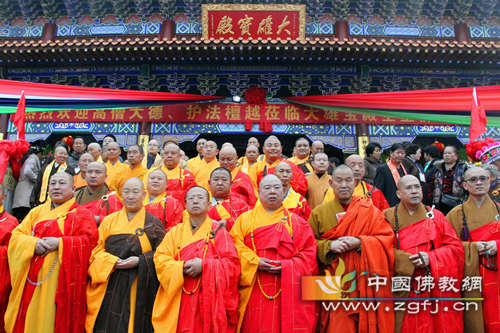 庆典圆满后,诸位高僧移步大雄宝殿,举行开光法会。主法的五位法师为性妙大和尚,果慧大和尚,法鉴大和尚,达开大和尚,清缘大和尚。整个法会依仪轨,起香唱赞,法师们用巾拂尘、举镜照空,拂去众生心地上的垢尘,去垢显净;以笔点佛眼,则为开发众生智慧,引领众生去除烦恼,大殿内梵音缭绕,佛事井然不紊,殿外信士大众虔诚瞻仰。开光法会圆满落下帷幕。