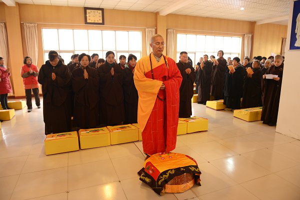 上午9:00点,在隆重迎请仪式后,大众真诚求受三皈依并礼请上开下应大和尚为亲教师,大和尚为现场大众皈依、宣读法名,并慈悲开示;大众庄严宣誓“众生无边誓愿度,烦恼无尽誓愿断,法门无量誓愿学,佛道无上誓愿成!”。之后大众齐诵“八十八佛大忏悔文”,双膝长跪,真心忏悔,以求忏悔诸恶业,蒙诸佛加持,今生往生成佛不退转。