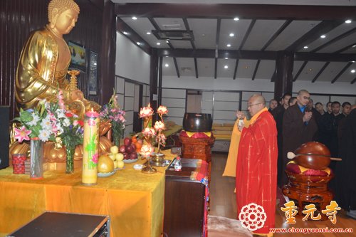17日晚7时,重元寺监院光瑞法师率领两序大众与百余名在家居士,一起举行隆重的净坛仪式。四众弟子同持大悲咒,法师以杨枝净水净坛。