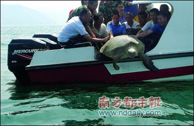 请教大师后,陈老板选定昨天上午11时为“吉时”。在放生海龟前,陈老板还请了近10名男子把海龟抬到南澳街道圩镇的天后宫拜了妈祖,为自己及身边的渔民祈福,同样也为海龟祈福,希望它回归大海后健康长寿。香港居民何志伟先生听到海龟放生的消息,当天一大早就坐直通巴士赶到南澳,希望能一起护送海龟回家。据介绍,海龟已成为地球上的濒危物种,我国列为国家二级保护动物,禁止捕杀。