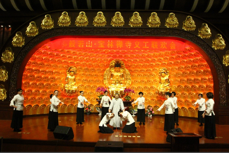 联欢会上,义工居士们各展所长,寓教于乐。以音声、才艺为佛事,宣传爱国爱教、孝亲尊师等祖国传统文化思想,自利利人,广结佛缘,普种善根。