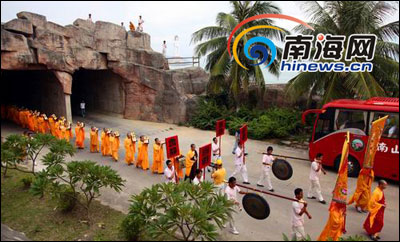 5日是农历九月十九,即观音出家纪念日,三亚南山寺方丈新成大和尚带领全体僧众举行水陆法会送圣大巡游仪式,为游人们洒净祈福,现场有一千余名信众和游客参加。该活动是南山寺本年度最为重要的佛事活动,但却打破历年的常规,让梵音融入游人们中,让中外游客感受和参与和谐社会中的人间佛教。