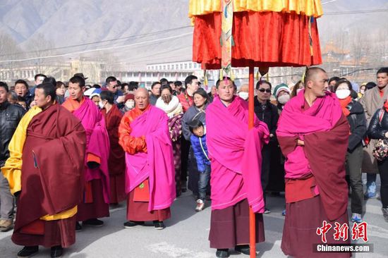 2016年2月20日,农历正月十三,有着“世界藏学府”之称的甘肃拉卜楞寺举行了一年一度的正月晒佛节。当天,伴着蓝天白云和温和的阳光,覆盖在巨幅佛像唐卡上的黄色丝绸缓缓拉开,巨大佛像出现在拉卜楞寺前的晒佛台上,引得数万藏族民众及游客纷纷赶来瞻仰神圣佛容。 拉卜楞寺位于甘肃省甘南藏族自治州夏河县,是藏传佛教格鲁派六大宗主寺院之一,始建于1709年,迄今已有300多年历史。每年自农历正月初三开始,拉卜楞寺都要举行一年一度的正月法会,晒佛法会是正月法会的重要内容之一。