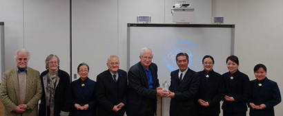 何日生主任代表上人致赠琉璃佛给龚布齐教授(左五),感恩龚布齐教授对慈济长期的支持与指导。(图片来源:凤凰佛教)