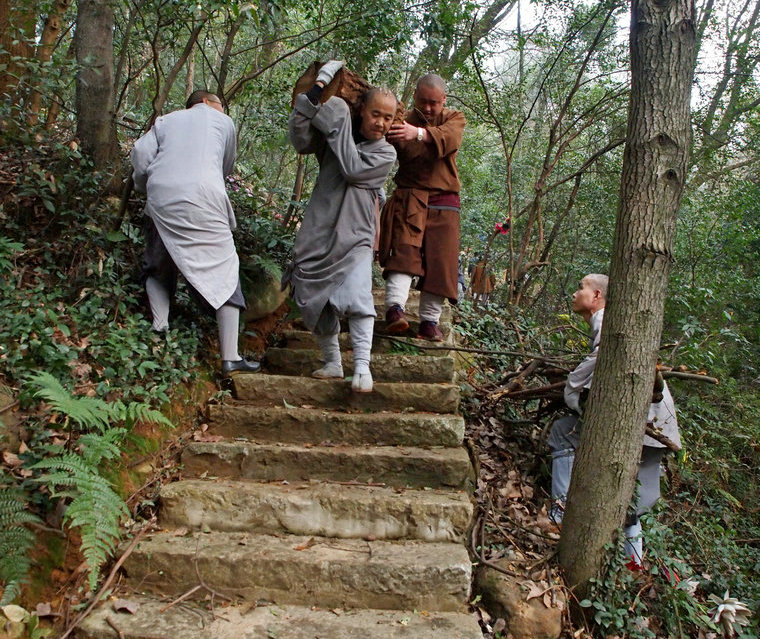 在春日暖暖地阳光中,在道友们心中朗朗佛号地加持下,缁白二众不怕脏累,同心协力,尽心尽力地为庄严道场而劳作。大众收集、清理电工房后面一带山坡的废置木材与干枯树枝,并运送至大寮后面堆放起来。