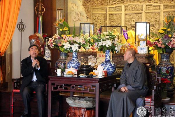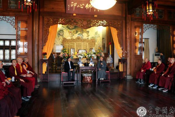 浙江省佛教协会会长、本山方丈怡藏大和尚与郭志国处长一行在颂古堂亲切交谈,并详细介绍了雪窦山资圣禅寺的悠久历史和丰富的文化底蕴。