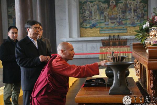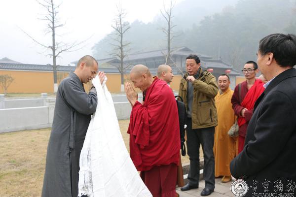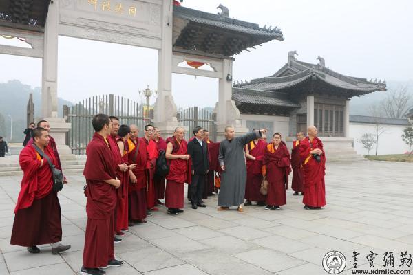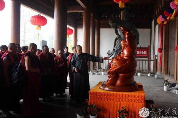 2016年3月19日,中国藏语系高级佛学院教务处副处长郭志国率第八届中级学街班(宁玛派)一行共28人来山参学,本山监院持定法师为佛学院一行简单的介绍了应梦名山的来历与雪窦山资圣禅寺所包含的意义。