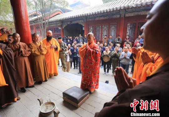 少林寺第31代传人、武僧总教头德扬法师在32代传人皈依拜师仪式现场