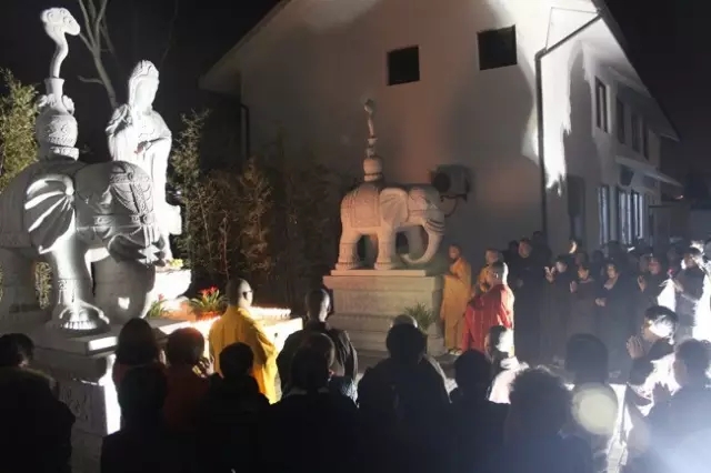 晚十二时,信众们手捧酥油灯,净心聆听妙华法师唱诵《观音菩萨悲赞》,每个人的感恩之心、忏悔之心、诚敬之心、向往之心都默默地融入法师虔敬慈悲的赞歌声里,相信寻声救苦、耳根圆通的大慈大悲观世音菩萨定能听到弟子们真诚的祝福与呼唤,并会放光加持,激励大家用功办道,让大家做一个快乐的、精彩的、自信的修行人,做一名不辱佛菩萨教诲的、光荣的、合格的三宝弟子。随后,信众们一边念颂着观音菩萨圣号,一边虔诚地将一盏盏酥油灯供奉于露天观音菩萨的座前。