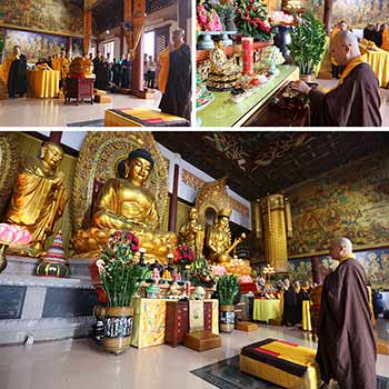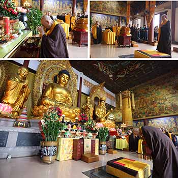 上午八时,诵经法会在大雄宝殿举行。近日寒潮来袭,气温骤降,信众礼佛之诚不减,依旧早早上山礼佛。大雄宝殿内四众弟子跟着常住法师一道礼拜诸佛,念佛名号,共诵《药师琉璃光如来本愿功德经》、《药师宝忏》。信众专心致志诵经,一心称念药师佛名号,眼中心中但有诵经一事,诚敬可感。药师佛感念信众的虔诚必定庇佑众生消灾延寿。