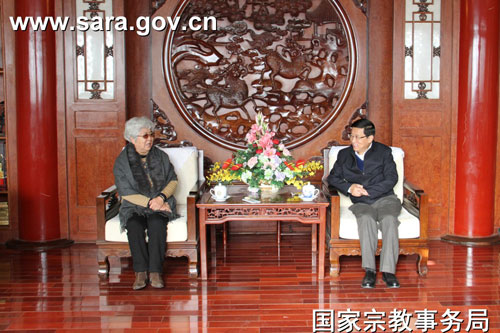 菩萨在线北京讯 10月31日,全国政协原副秘书长、《紫荆》杂志社原社长陈洪,《紫荆》杂志社社长杨勇等一行参访国家宗教局,蒋坚永副局长与他们进行了会谈。