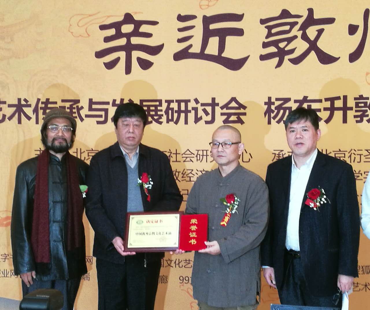 对于本次展出的杨东升先生三十年倾心创作的数十幅敦煌艺术精品大作,学会已经组织专家做了持续数月的评估鉴定,对他在继承和发展敦煌艺术方面取得的成就给予充分的肯定和认证。在今天的开幕式上,曹中建副会长、认证组组长何劲松教授和中国宗教学会顾问王志远教授一行向杨东升颁发了《规则》实施后的第一份认证证书。