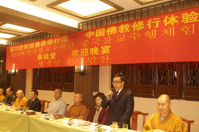 下午,代表团抵达梁平县双桂堂。中国佛教协会副秘书长、重庆佛教协会会长、重庆双桂堂方丈身振法师率四众弟子在山门列队,热情欢迎韩国佛教代表团的达到。在双桂堂为代表团举办的欢迎晚宴上,身振法师代表双桂堂致欢迎辞,韩方团长性空法师致答谢辞,重庆市民宗委喻柏炎副主任、梁平县政府唐诗平副县长分别代表重庆市、梁平县政府致欢迎辞。