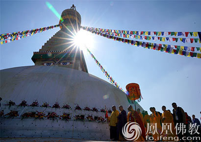 尼方政府专机播洒吉祥花庆祝圆满塔开光(图片来源:凤凰佛教 摄影:昌俊)