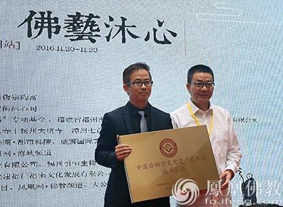 中国鉴真东渡文化专业委员会成立仪式上,中国非物质文化遗产战略发展联盟常务理事刘俊先生为福建省引恒文化传播有限公司董事长施恒贵先生授牌。(图片来源:凤凰佛教)