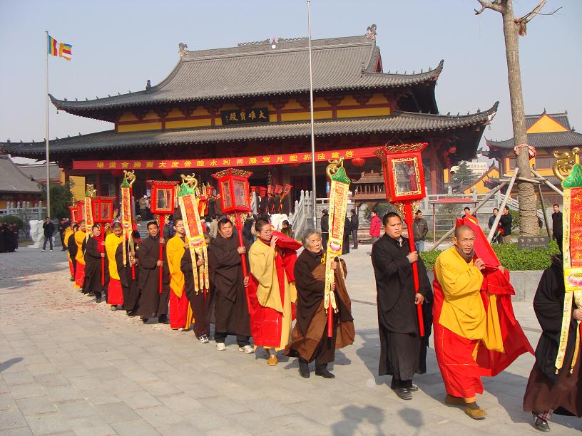 送圣队伍浩浩荡荡,走出山门,沿着涟城中山路东行,延伸足有500米长,引来了众多围观者和信众的瞩目赞叹。最后抵达涟水实验小学外边的操场空地上。只见镇坛大将军手持“慈航普渡”和“镇守坛前”的幡旗巍然立在送圣地点。镇坛大将军的后面是一艘纸糊的西方大船,船边堆满了纸折的莲花和金元宝。众僧列队面对镇坛大将军和西方大船,一起唱诵,并把二十四席牌一一放到西方大船里,三位法师率众僧及信众起腔念诵,与此同时,鸣放鞭炮,点燃西方船,祈愿镇坛大将军护持西方船上的所有亡灵顺利前往西方极乐世界。持续大约一个半小时,水陆法会送圣仪式圆满结束。