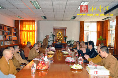 座谈中,界象法师首先向考察团介绍了闽南佛学院的基本概况及学院行政管理方面的情况。随后,参访团就闽院领导班子、制度建立、教学重点、课程设置、经费、师资、学僧生活以及学院与寺院的关系等问题与闽院法师们进行了探讨、交流。最后,彻性法师代表考察团一行向闽院法师们的热情解答表示衷心的感谢,双方互赠礼品留作纪念。