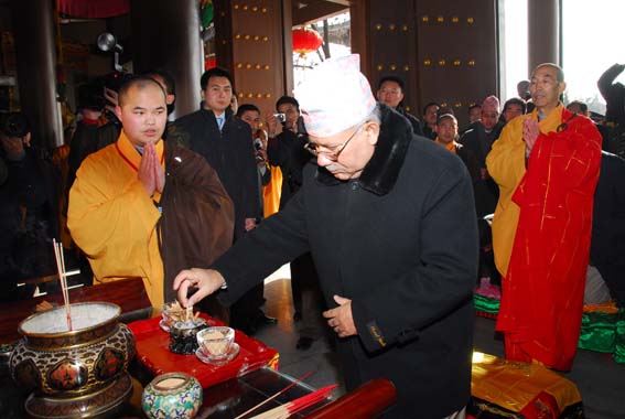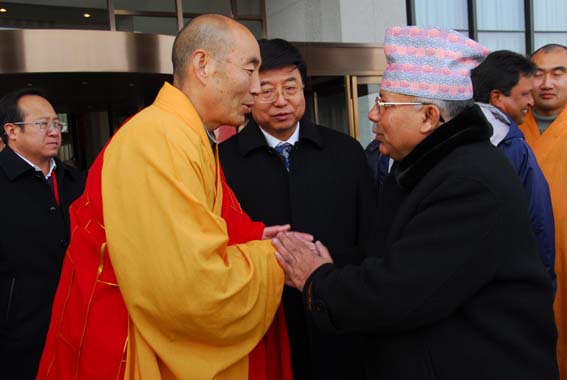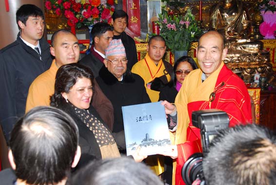 2009年12月28日,法门寺广场地铺大红地毯,僧众列队站立两侧,11时尼泊尔总理马达夫·库马尔·尼帕尔、随团来访的有总理夫人、副总理兼外长、财政部长、能源部长等一行30余人,在中国驻尼泊尔大使邱国洪等人员陪同下来到法门寺参拜佛指舍利,受到法门寺两序大众热烈欢迎。法门寺智超法师、来正法师、果清法师、洪利法师、智雄法师、慧慈法师分别向总理介绍了法门寺的历史、现状及未来努力的方向。(文:果清)