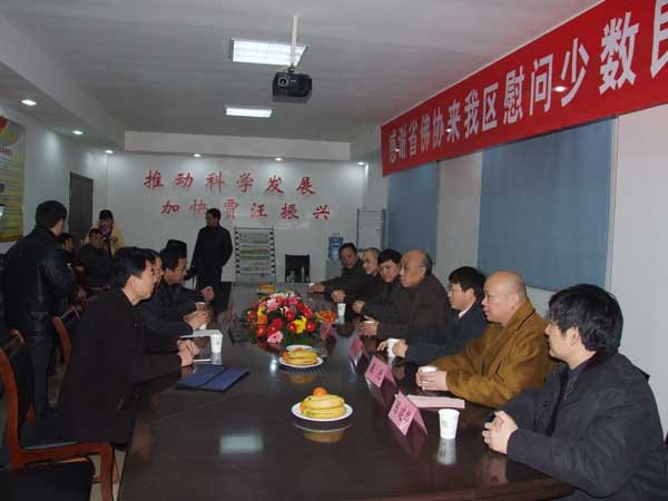 在贾汪区夏桥办事处,贾汪区副区长孙清理、贾汪区民宗局局长鹿文继等对省民宗局领导、省佛协领导的慰问表示热情欢迎和感谢。这次活动,省佛教协会拿出40万元资金对苏北地区少数民族特困户春节慰问,对徐州100户少数民族特困户每户发放400元慰问金。贾汪区夏桥办事处刘德华、陈广立等五户回族特困户接过省佛协领导的慰问金,不禁热泪盈眶,更加感谢党和佛教界的关心。