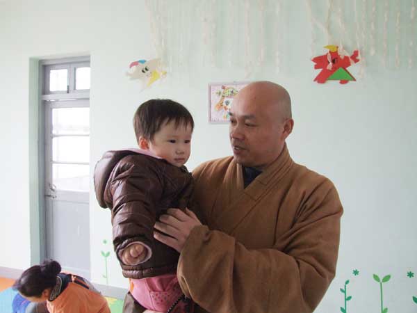 这天上午,细雨蒙蒙,春寒料峭。果光大和尚一行人冒着细雨,带着事先购好的1000元慰问食品和2000元现金,驱车前往徐州市社会福利院,看望生活在这里的孤残儿童和孤寡老人。果光大和尚看到孩子、老人们在这里生活得很幸福,他非常高兴。孩子们张开臂膀投向他的怀抱,他亲切地抱起孩子,抚摸着孩子天真可爱的脸庞,祝愿他们健康成长;他慈善地拉着老人的手问寒问暖,祝愿老人们身体健康,生活快乐。