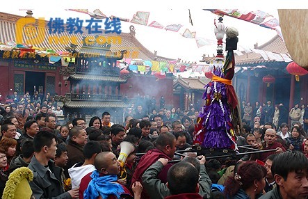僧众诵经祈愿后,一个魔鬼形象的“巴令”被抬出,信众们纷纷用哈达扫满全身并将沾满晦气的哈达献于“巴令”,并从“巴令”下钻过,喻意晦气、灾病被带走。僧众穿上奇特的装束进行“打鬼”的舞蹈跳恰。跳恰过后“巴令”被抬出山门用火焚烧。
