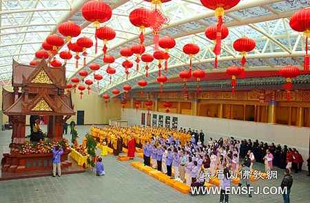 迎佛仪式由峨眉山佛教协会常务副会长传智法师主持,丽善郡主与数十位泰国信众和峨眉山的法师们一起,诵念祝祷,虔诚礼拜,仪式如法如律,庄严神圣。随后,受峨眉山佛教协会会长永寿法师的委托,传智法师代表峨眉山佛教协会向丽善郡主一行致欢迎辞,对他们的善愿善行给予了高度赞扬。
