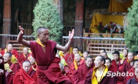 立宗答辩仪式结束时,按照传统宗教惯例,所有参加答辩仪式的僧人集体诵经祈祷释迦牟尼,色拉寺领经师嘎玛领诵经文。