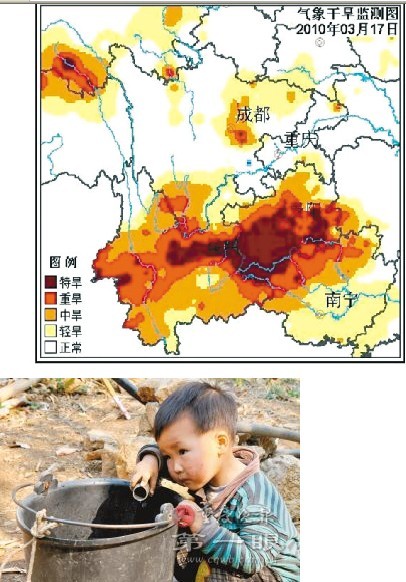 日前,中国西南5省市区正在遭受历史罕见的大旱。云南、广西部分地区的旱情已达到特大干旱的程度,贵州省秋冬连旱,出现80年一遇,甚至百年一遇的旱情。