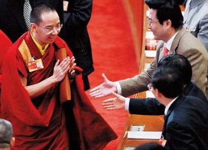 2010年3月13日,在全国政协第十一届三次会议闭幕会上,一些政协委员争先与十一世班禅握手。