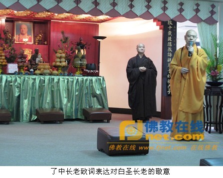 净良长老在致辞时,表示台湾中国佛教会将于5月3日率团护送白公长老舍利到江苏常熟兴福寺安奉,并路经上海静安寺暂奉,以慰白圣长老未完之遗愿,促进两岸和谐。随后,在净心长老指示下,白圣长老舍利被请出,并交由净良法师安排,以便届时迎请与护送。