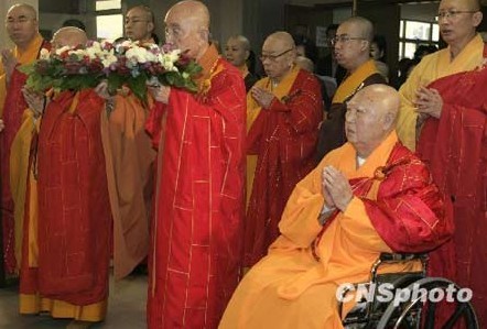 4月24日,香港佛教联合会为青海玉树地震受灾灾民举行“青海玉树大地震祈福息灾冥阳两利法会”,法会由香港佛教联合会会长觉光法师亲临主法,全港各佛教团体代表出席。图为觉光法师等向亡灵献香、献花致悼。 (来源:中新社 摄影:张勤)