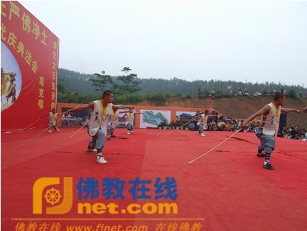 开光法会典礼结束后,来自河南嵩山少林寺武术学校的武僧为嘉宾们进行了精湛的武术表演;下午3时,上林县莲音寺住持昌杰法师、辽宁归茗寺住持通逵法师共同主法,引领信众举行了放生法会。