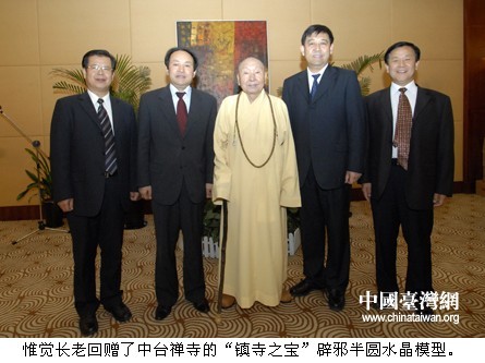 会见后,闫超英向惟觉长老赠送了代表陕西特色的礼品“华县皮影”,惟觉长老回赠了中台禅寺的“镇寺之宝”辟邪半圆水晶模型。(文:中国台湾网、陕西省台办联合报道)