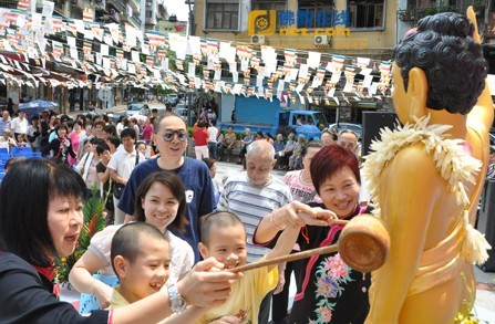 为纪念佛陀诞生日,澳门禅净中心于2010年5月9日上午10点整在三盏灯前地举行“威德福海迎佛诞”浴佛法会。