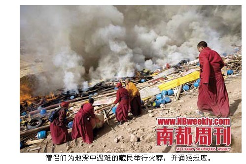 震后最大的一场法会是4月17日在扎吉大通的火化。平日里,家中有人死去,藏民会请来两三名僧人念经,而这次则由上千名高僧大德集体为亡者诵经超度。火化现场,肃穆大于悲怆。