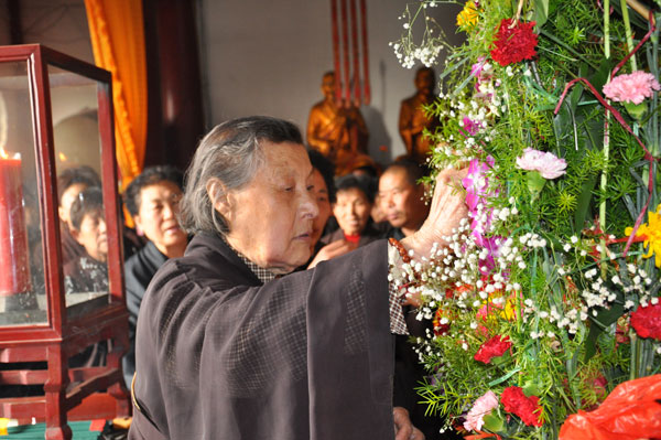 这天早上七点半,兴化寺磬鼓齐鸣,梵乐弥空,大雄宝殿内外已列序站满了来自苏鲁豫皖周边地区的四众弟子,足有三四百人。法师们首先迎请太子佛。果光大和尚手托太子佛小心放在摆满鲜花的供桌上,然后虔诚礼佛,领众诵经。按照浴佛仪规,从果光大和尚开始列队用鲜花、净水为太子佛沐浴。整个法会延续一个多小时,庄严有序,功德圆满。