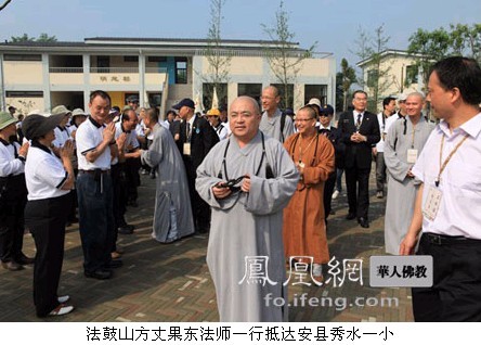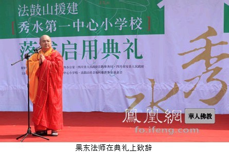 凤凰网华人佛教四川讯:2010年6月3日,经过两年的不懈努力和筹备施工,由台湾法鼓山援建的四川安县秀水镇中心卫生院、秀水镇第一中心小学正式落成启用。台湾法鼓山方丈果东法师、副住持果品法师、法鼓山慈善基金会秘书长果器法师、什邡罗汉寺方丈素全法师、四川省宗教事务局局长王增建、副局长余孝恒、四川省台办副主任张军、绵阳市委书记吴靖平、绵阳市副市长赵琪、绵阳市委秘书长王黎、安县县长赵迎春及秀水镇第一中心小学学生、秀水镇中心卫生院医护人员、秀水镇民众等近4000余人与来自台湾的护法信众一起见证了法鼓山家园重建圆满落成的历史时刻和感人瞬间。
