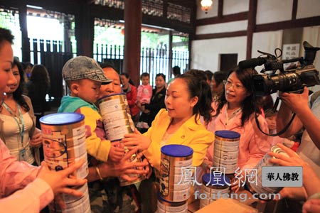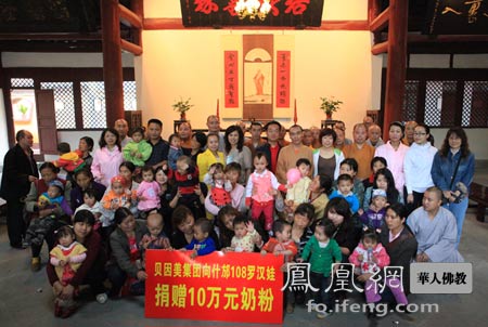 华人佛教什邡讯 2010年6月6日上午,由杭州贝因美集团、凤凰网联合策划组织的爱心公益活动--赠送108罗汉娃价值10万元贝因美奶粉捐赠仪式在什邡罗汉寺举行。什邡市宗教局副局长江波、什邡罗汉寺爱心办、什邡108成长基金、什邡妇幼保健院、杭州贝因美集团、凤凰网华人佛教及部分108地震宝宝和罗汉寺全体僧众参加了捐赠仪式。