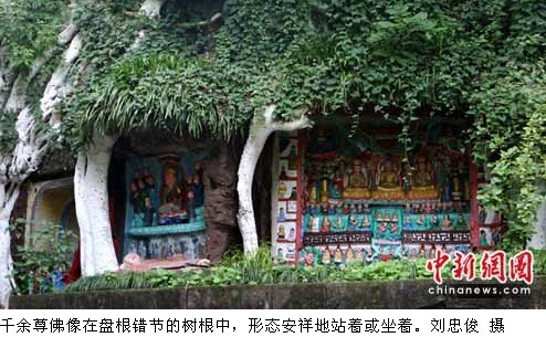 在佛教理论中,菩提树和佛祖素有渊源,佛和树常常相伴出现。8日,记者在四川省乐至县报国寺内发现千余尊神态各异、大小不一的摩崖造像镶嵌在一棵千年榕树的树根之中,佛和树相应而生的奇异景观。