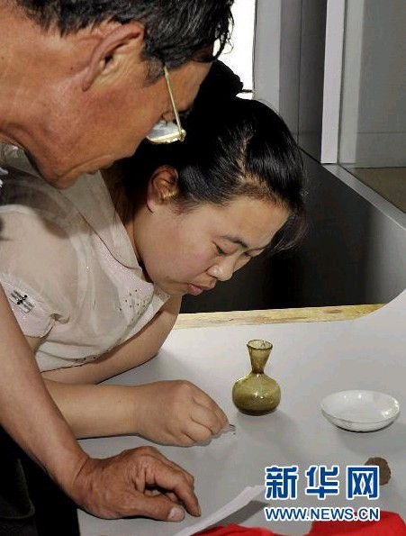 据馆长王未想介绍,被评定为国家一级文物的琉璃瓶于1990年抢救维修辽上京北塔遗址时在天宫内发现,因琉璃瓶壁用金粉装饰,虽有脱落,但并不透明,无法看到瓶内盛物。时任博物馆馆长金永田在现场曾开启瓶盖,见舍利子后即封盖珍藏密封保存至今。