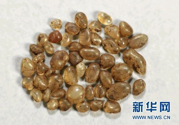 巴林左旗辽上京博物馆发现的佛舍利(6月4日摄)。内蒙古赤峰市巴林左旗辽上京博物馆于“文化遗产日”当天向社会披露,近日在进行馆藏珍贵文物数据采集拍摄文物时,在当年出土于辽上京遗址北塔天宫的琉璃瓶内发现48颗罕见佛舍利子。新华社发(庞雷摄)