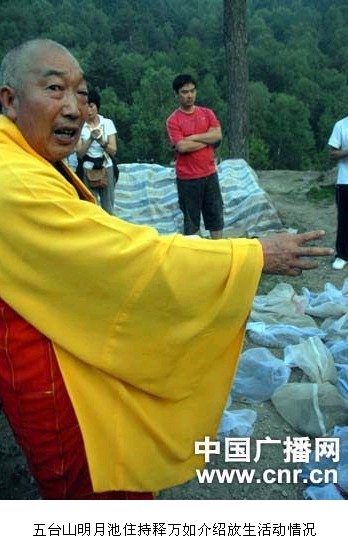 据主持“做佛事加持放生仪式”的五台山明月池住持释万如介绍,放生的动物是居士们从从北京、天津等地的饭店里收购、专程运到五台山来放生的,放生的动物包括80只狐狸、300多斤蛇、140只刺猬、松鼠480多只。