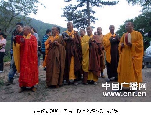 中广网山西五台山6月15日消息(记者康维佳 李先刚)端午节小长假,佛教圣地山西五台山游客如织。6月14日下午,一场“端午节做佛事加持放生仪式” 在五台山明月池举行,五台山明月池18位僧人、来自全国各地的270多位居士及数百名游客参加放生活动。