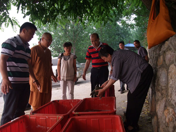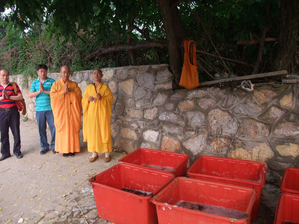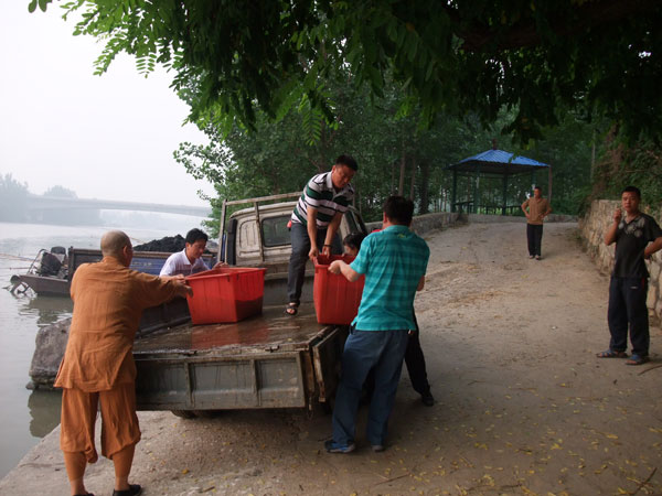 这天早上6点钟,江苏徐州兴化寺监院常信法师及暑假归来的泰国国际佛教大学研究生明慧法师带领兴化寺弘法功德会的工作人员、众居士到徐州灯塔农贸市场和段庄农贸市场购来1万6千元的甲鱼、长鱼、泥鳅,驱车到大运河畔,举行了放生仪式。然后,把近万尾鱼放入波涛滚滚的大运河,使这些生灵又回归大自然的怀抱。