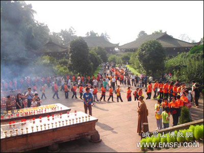 朝圣团一行口称普贤菩萨圣号列队走进万年寺