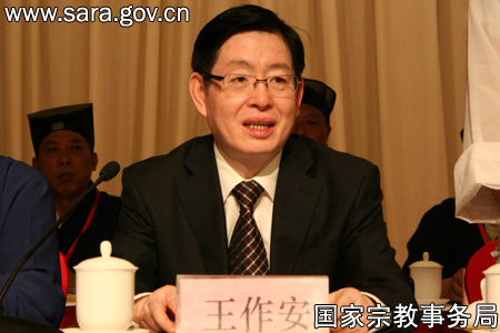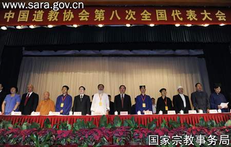 国家宗教事务局局长王作安在开幕式上讲话。他说,道教是在中华文化土壤中生长出来的传统宗教,其教理教义中包含着崇尚和谐、尊重生命、慈俭谦让、道法自然、天人合一等许多重要理念,是中华传统文化的思想源泉之一,也是人类思想文化宝库中的重要组成部分,对现代人类社会仍然具有重要的启迪意义。他指出,中国道教协会要大力培养人才,创建和谐宫观,加强团结合作,主动服务社会,积极扩大交流。希望中国道教协会新一届理事会以第八次全国代表会议为新的起点,振奋精神,团结一致,开拓进取,谋长远之策,行固本之举,引领中国道教健康发展,团结道教界人士和广大信众为促进科学发展和社会和谐、为中华民族伟大复兴作出新的更大贡献。