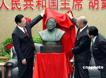 2008年5月,中国国家主席胡锦涛访日期间,与奈良地方官员一起为鉴真大师铜像揭幕。(图片来源:中新社资料图 陈超 摄)