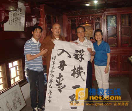 2010年7月7日,海南省政协原副主席、党组副书记洪寿祥先生与中国书协理事、海南省书协副主席詹冰莹女士以及雅园集团公司董事长郑涛先生参访江苏南京毗卢寺,受到了该寺方丈传义法师的热情接待。(文:圣德)