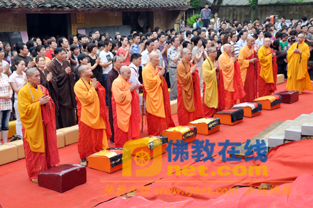 当天上午9时18分,上梁法会正式开始。主法的诸山长老有:宁波七塔寺方丈可祥法师、普陀山佛协咨议委员会主席道生长老、五磊寺方丈宗立法师、阿育王寺首座立悟法师、普陀山佛协咨议委员会副主席智禅长老、洞山寺住持广传法师、法王寺住持弘法法师、静宗寺住持仁敏法师、伏龙寺住持传道法师等。