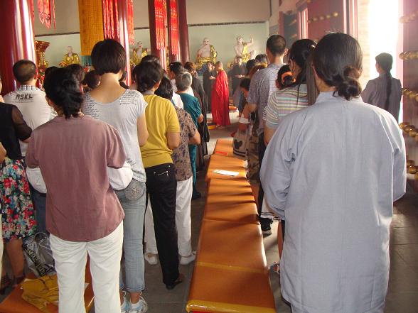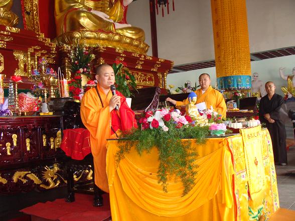 上午八点,在大雄宝殿门前首先举行放生仪式,四众弟子为放生水族生灵诵经、发愿、忏悔。接着,在大雄宝殿,曙正法师为六位发心出家、因缘成熟的净人亲手剃度。随后,又在大雄宝殿举办皈依法会,由曙正法师为大众开示,并为求受皈依的佛弟子传授三皈依。近百位信众虔诚求受,皈依仪式清净庄严,人人法喜充满。